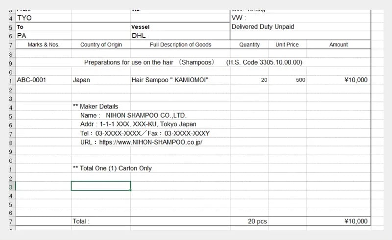 例をあげておきます。例えば輸出する商品がシャンプーの場合、インボイスに下記の文言を入れておくと通関の現場で迷うことがありません。